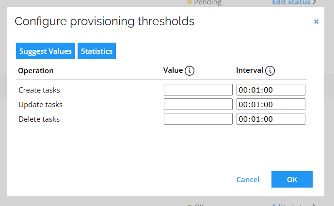 The Suggest values feature allows to calculate recommended provisioning thresholds values based on the statistics gathered for a selected system. To do so, the systemId is retrieved automatically and the interval settings values has to be provided manually.