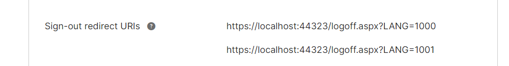 LANG=<Language ID>parameter in the Sign-out redirect URIs. This parameter should contain the ID for any language you anticipate users will use, for example:https://localhost/logoff.aspx?LANG=1000https://localhost/logoff.aspx?LANG=1001